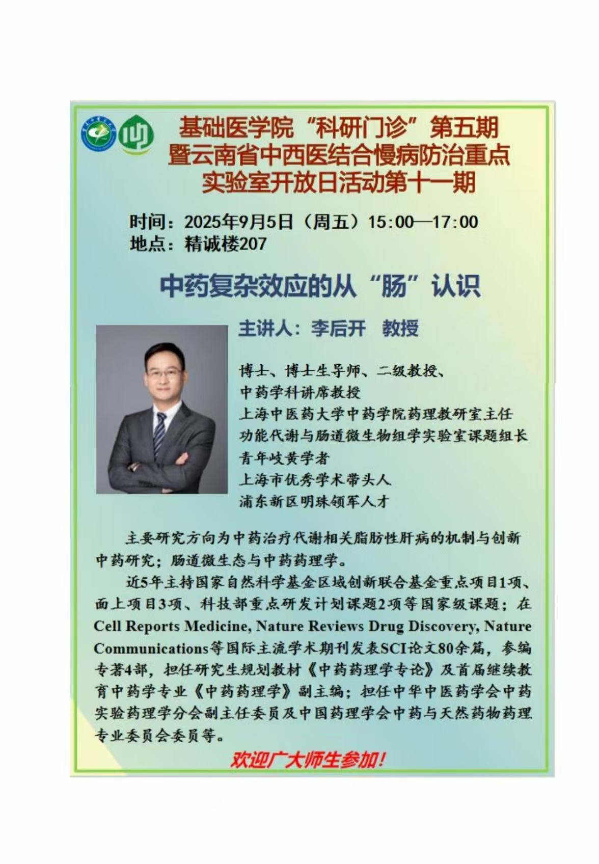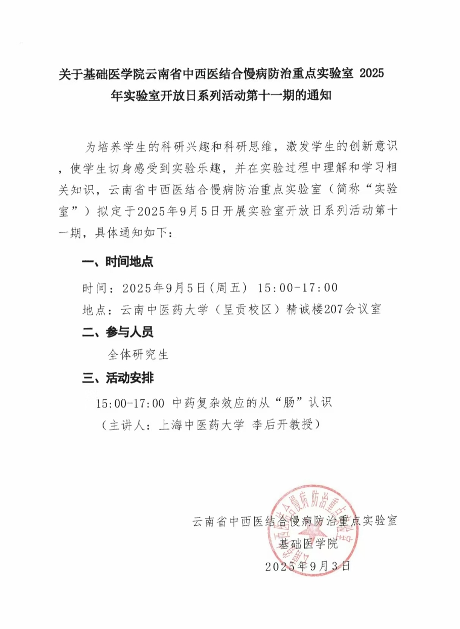 关于基础医学院云南省中西医结合慢病防治重点实验室 2025 年实验室开放日系列活动第十一期的通知
